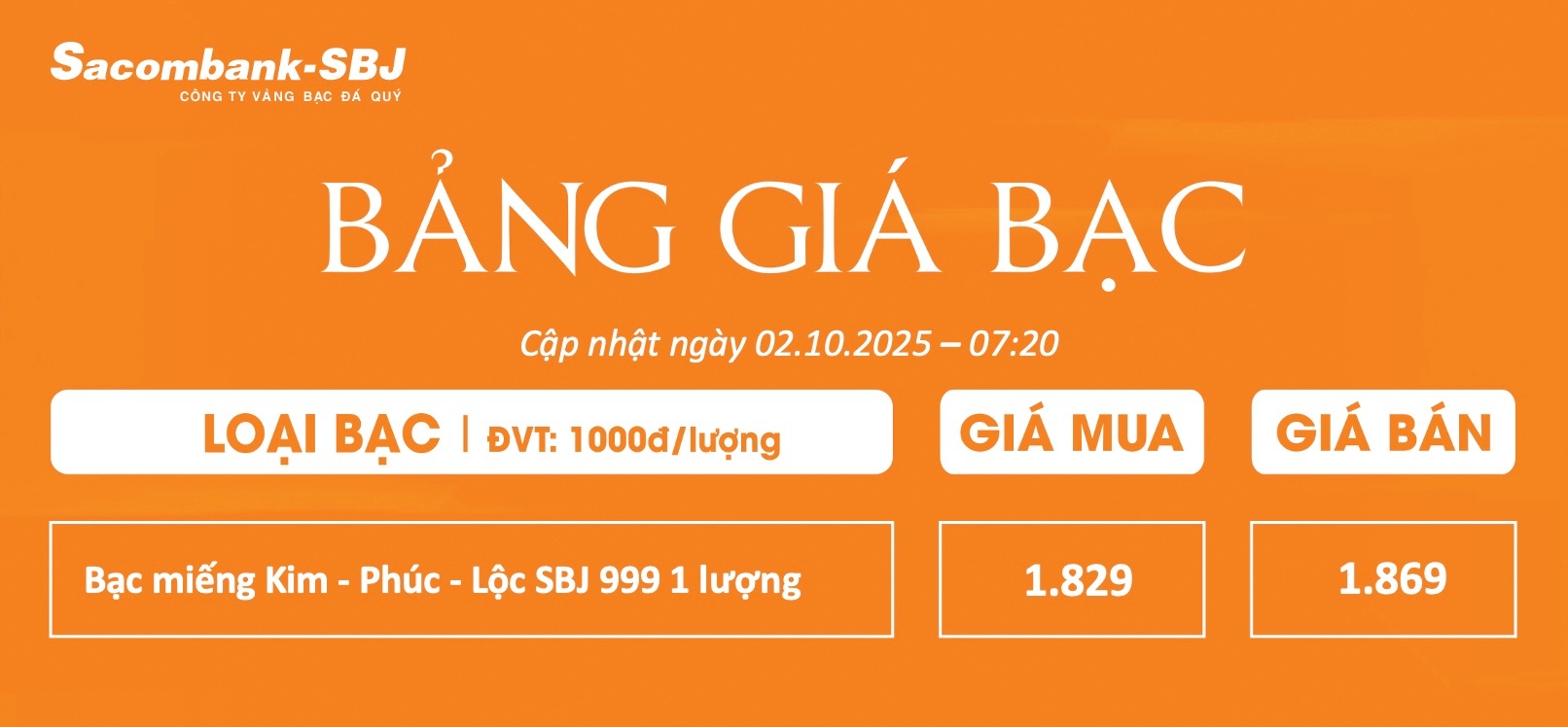 Bảng Tỷ Giá Bạc - Ngày 02/10/2025 - Bảng 1