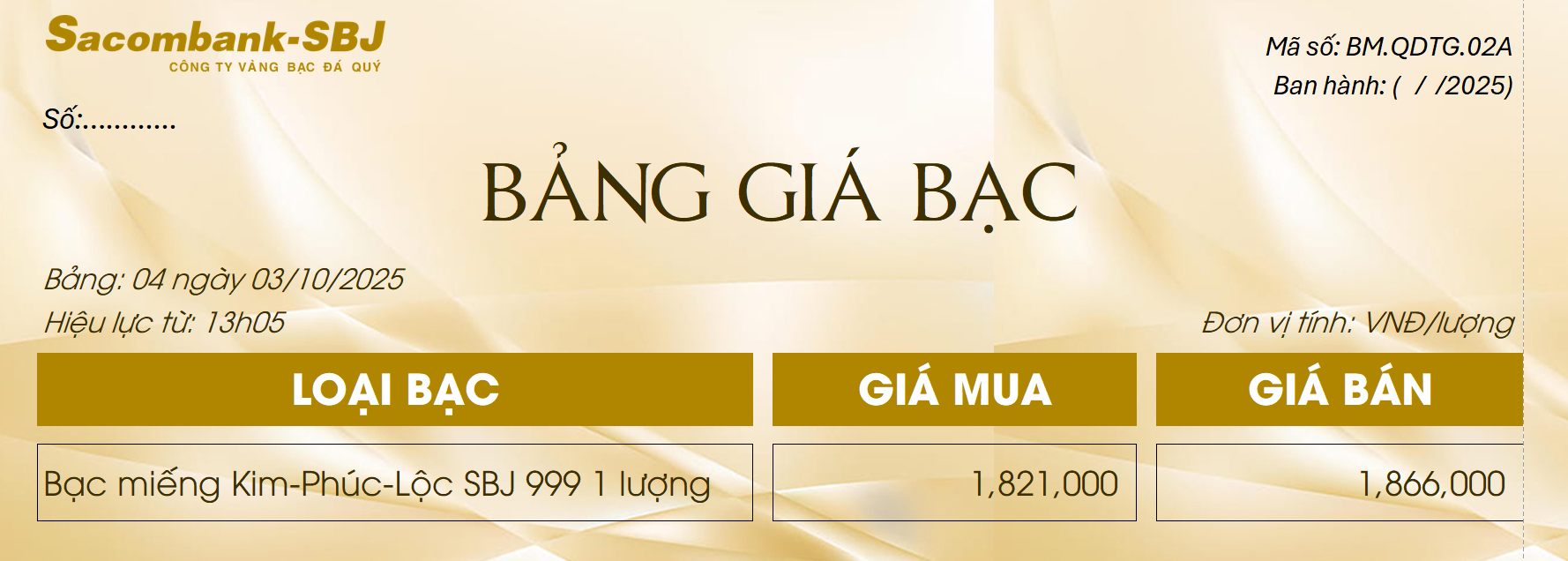 Bảng Tỷ Giá Bạc - Ngày 03/10/2025 - Bảng 4