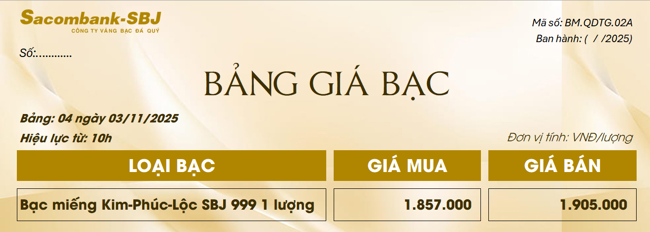 Bảng Tỷ Giá Bạc - Ngày 03/11/2025 - Bảng 4
