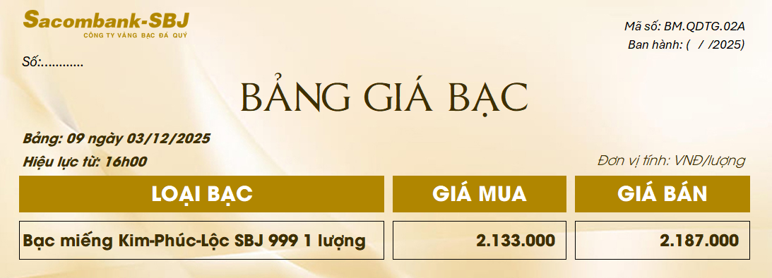 Bảng Tỷ Giá Bạc - Ngày 03/12/2025 - Bảng 9