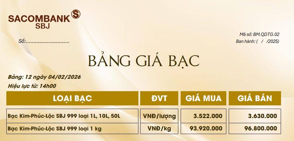 Bảng Tỷ Giá Bạc - Ngày 04/02/2026 - Bảng 12