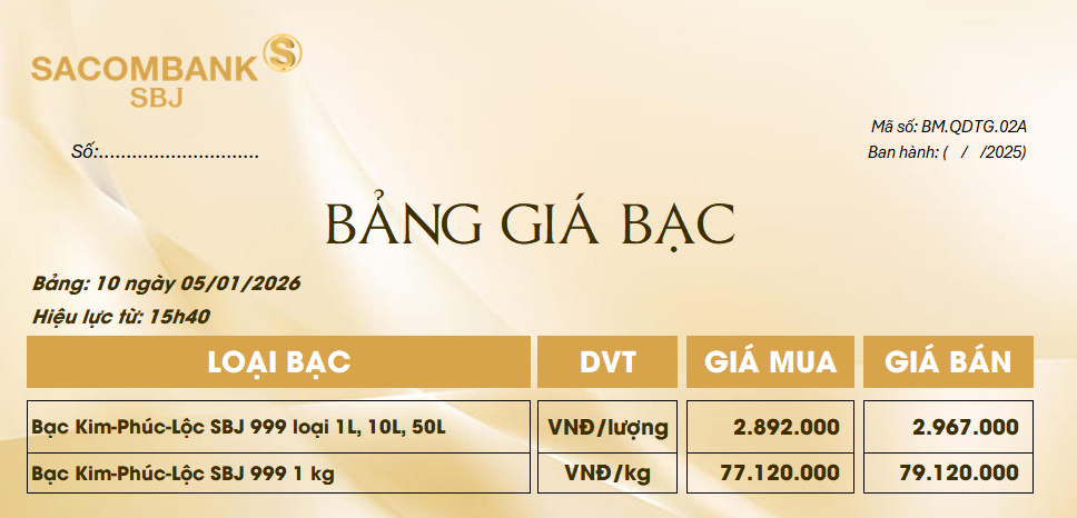 Bảng Tỷ Giá Bạc - Ngày 05/01/2026 - Bảng 10