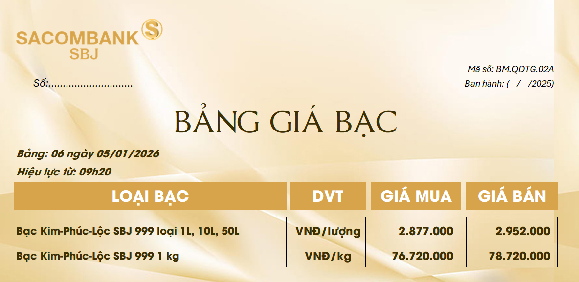 Bảng Tỷ Giá Bạc - Ngày 05/01/2026 - Bảng 6