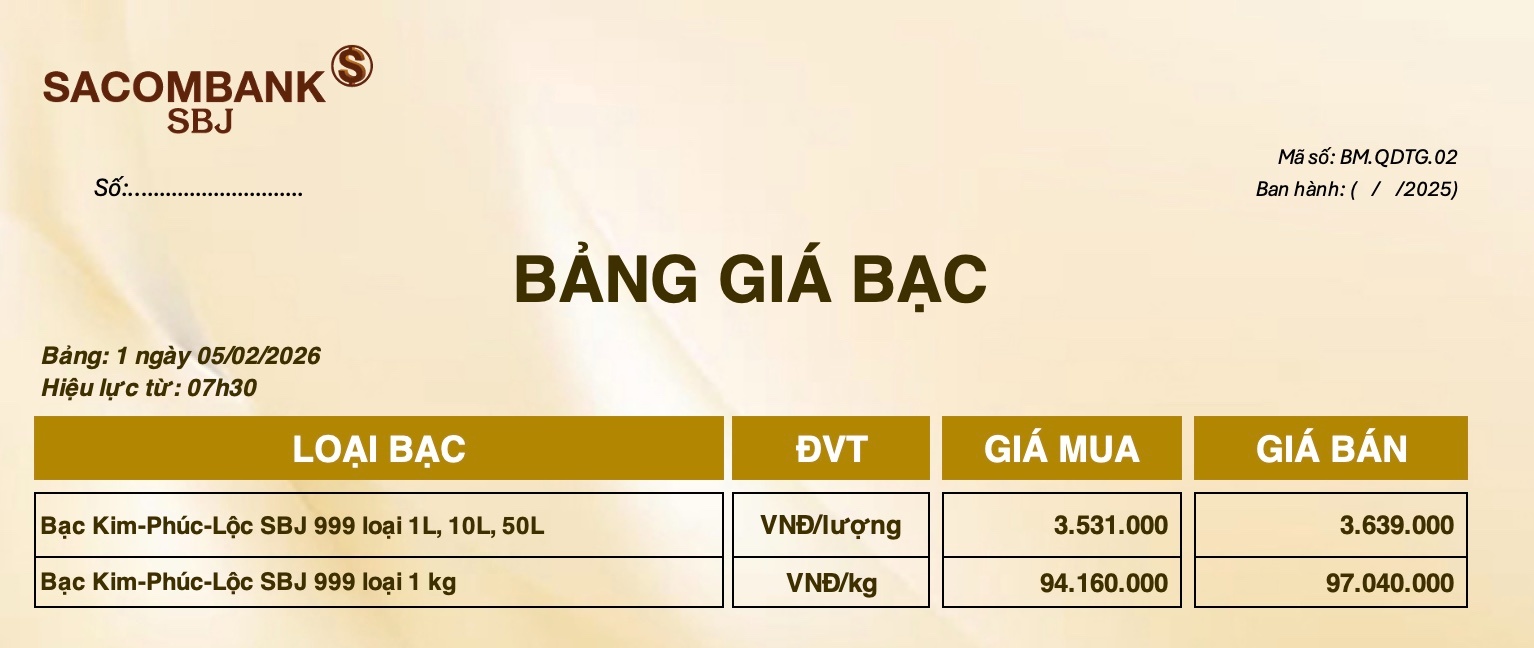 Bảng Tỷ Giá Bạc - Ngày 05/02/2026 - Bảng 1
