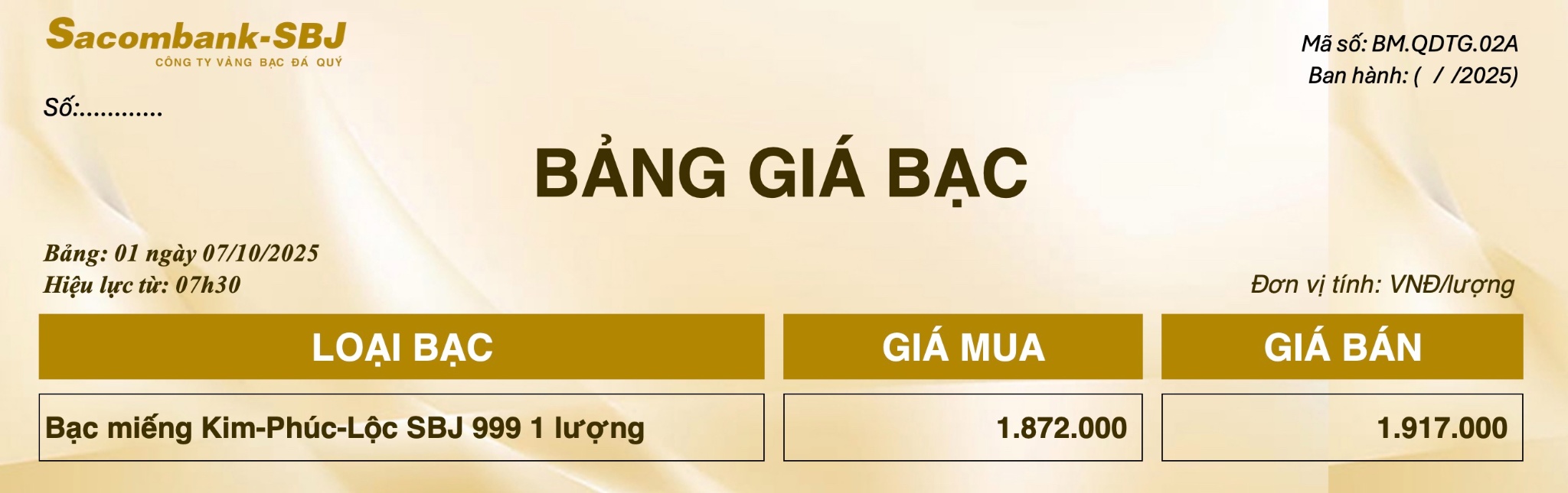 Bảng Tỷ Giá Bạc - Ngày 07/10/2025 - Bảng 1