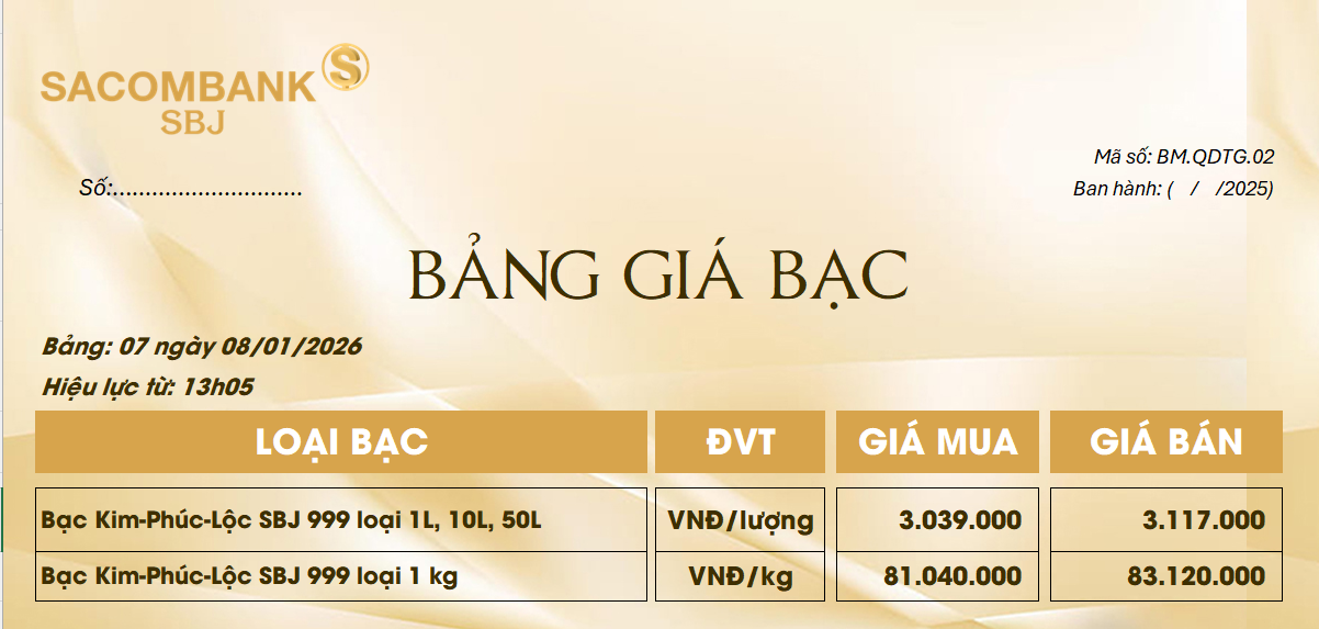 Bảng Tỷ Giá Bạc - Ngày 08/01/2026 - Bảng 7