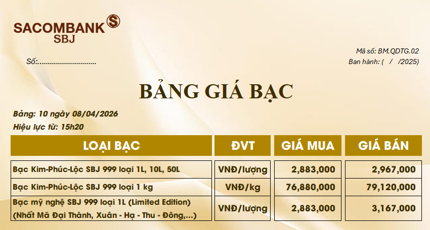 Bảng Tỷ Giá Bạc - Ngày 08/04/2026 - Bảng 10
