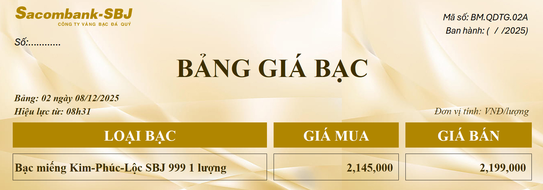 Bảng Tỷ Giá Bạc - Ngày 08/12/2025 - Bảng 2