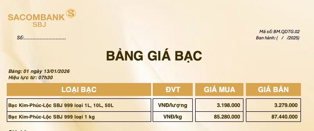 Bảng Tỷ Giá Bạc - Ngày 13/01/2026 - Bảng 1