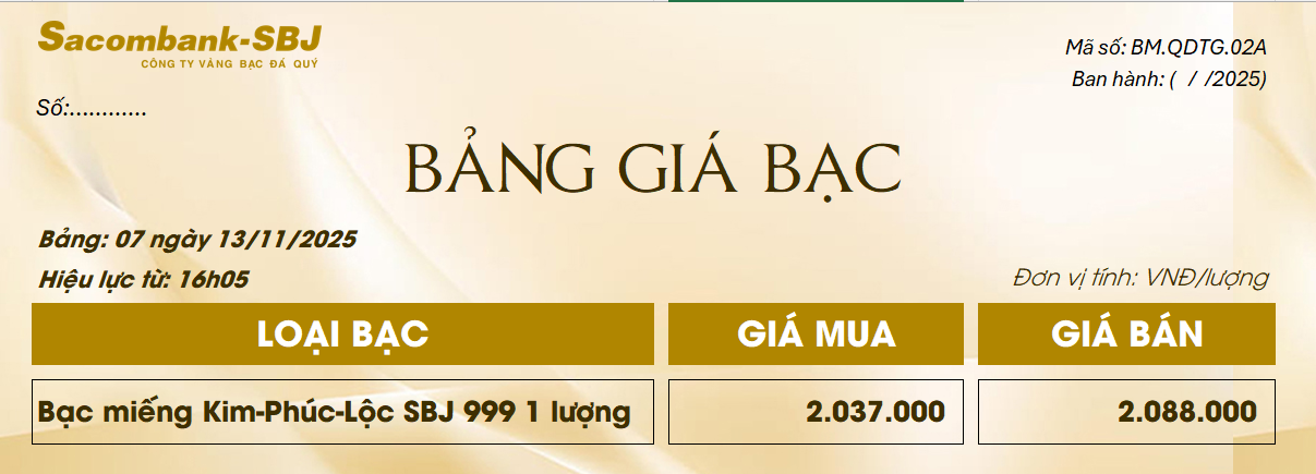 Bảng Tỷ Giá Bạc - Ngày 13/11/2025 - Bảng 7