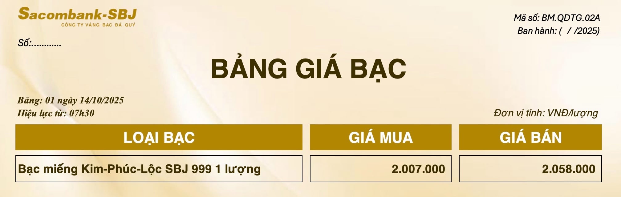 Bảng Tỷ Giá Bạc - Ngày 14/10/2025 - Bảng 1