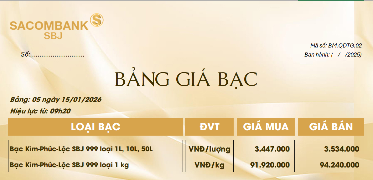 Bảng Tỷ Giá Bạc - Ngày 15/01/2026 - Bảng 5