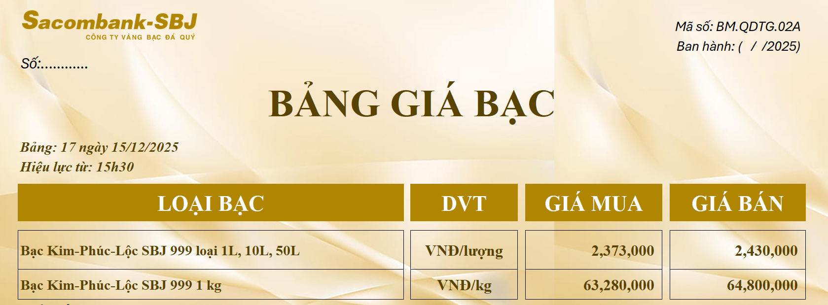 Bảng Tỷ Giá Bạc - Ngày 15/12/2025 - Bảng 17