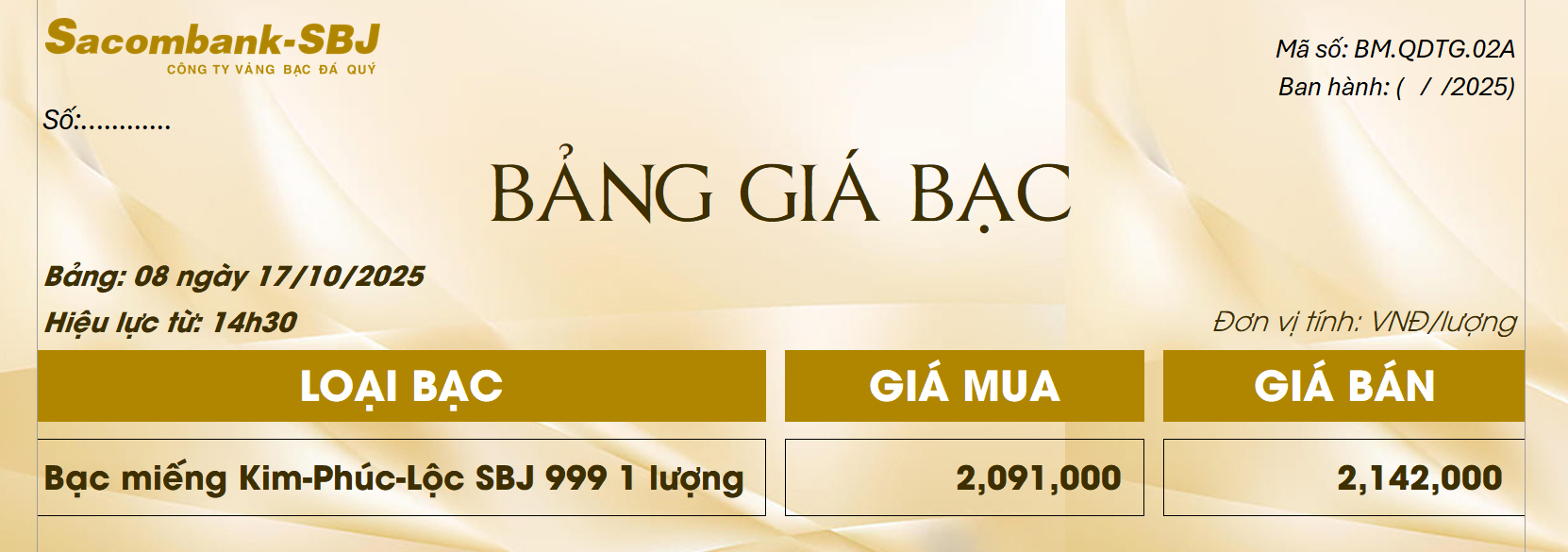 Bảng Tỷ Giá Bạc - Ngày 17/10/2025 - Bảng 8