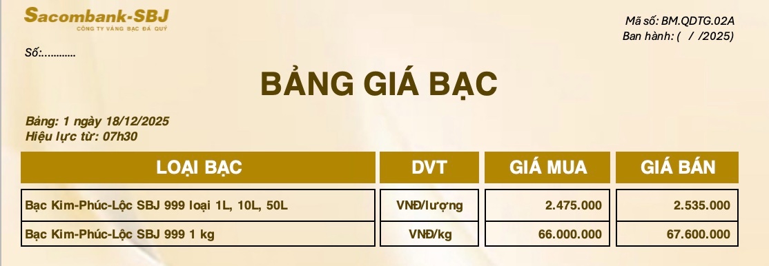 Bảng Tỷ Giá Bạc - Ngày 18/12/2025 - Bảng 1