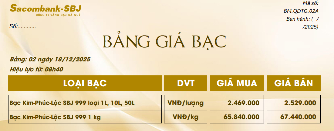 Bảng Tỷ Giá Bạc - Ngày 18/12/2025 - Bảng 2