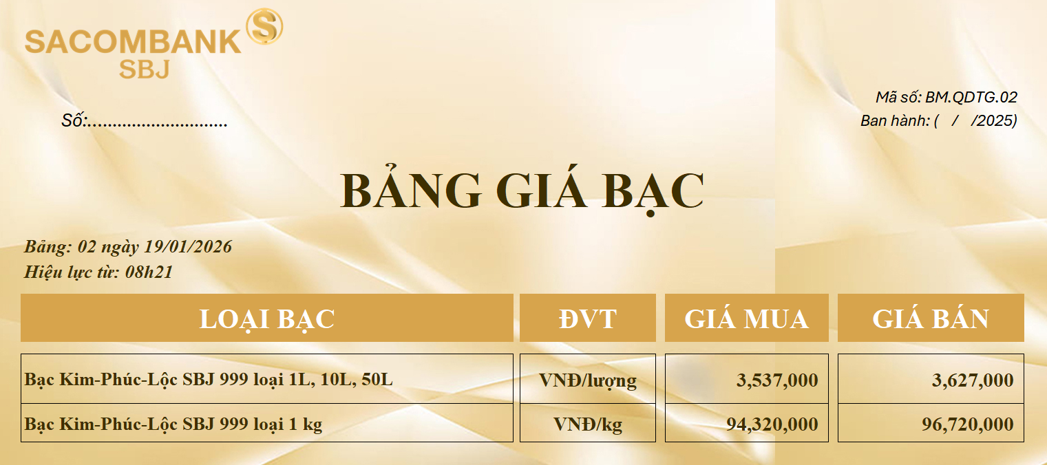 Bảng Tỷ Giá Bạc - Ngày 19/01/2026 - Bảng 2