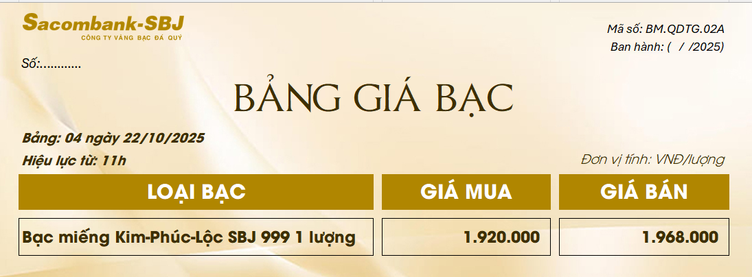 Bảng Tỷ Giá Bạc - Ngày 22/10/2025 - Bảng 4