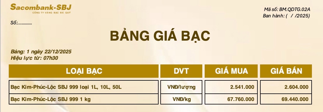 Bảng Tỷ Giá Bạc - Ngày 22/12/2025 - Bảng 1