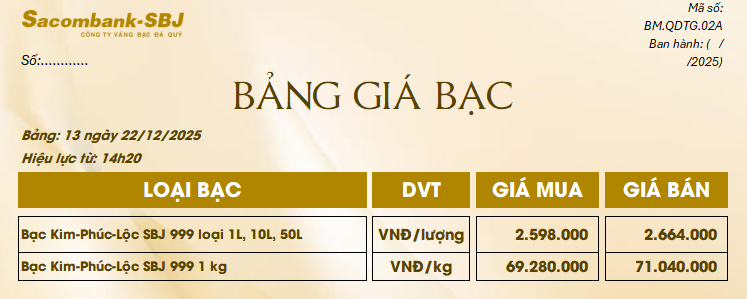 Bảng Tỷ Giá Bạc - Ngày 22/12/2025 - Bảng13