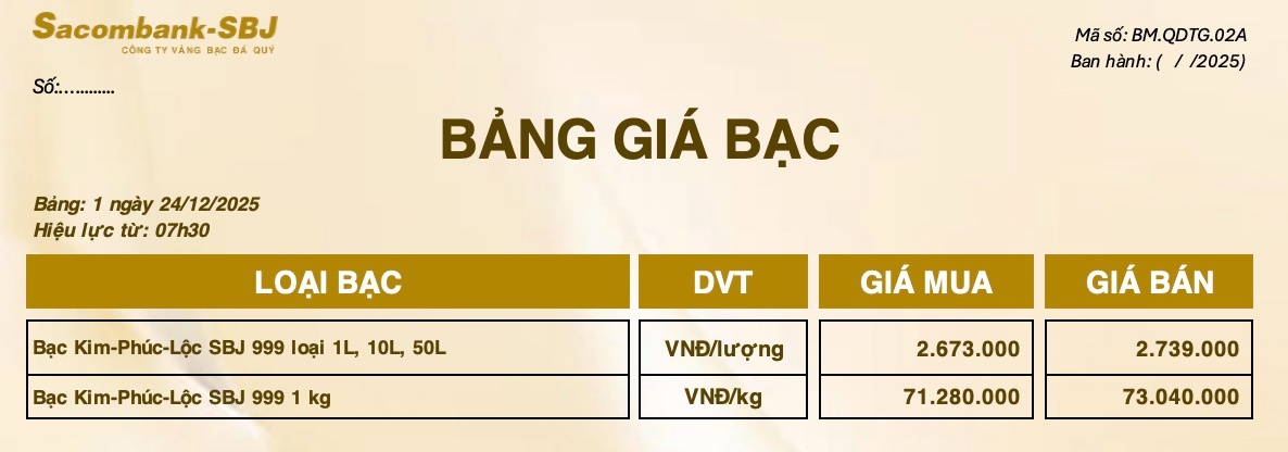 Bảng Tỷ Giá Bạc - Ngày 24/12/2025 - Bảng 1