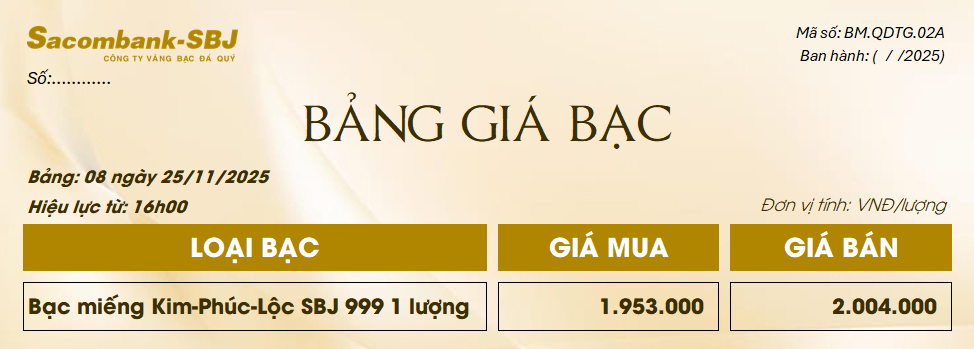 Bảng Tỷ Giá Bạc - Ngày 25/11/2025 - Bảng 8