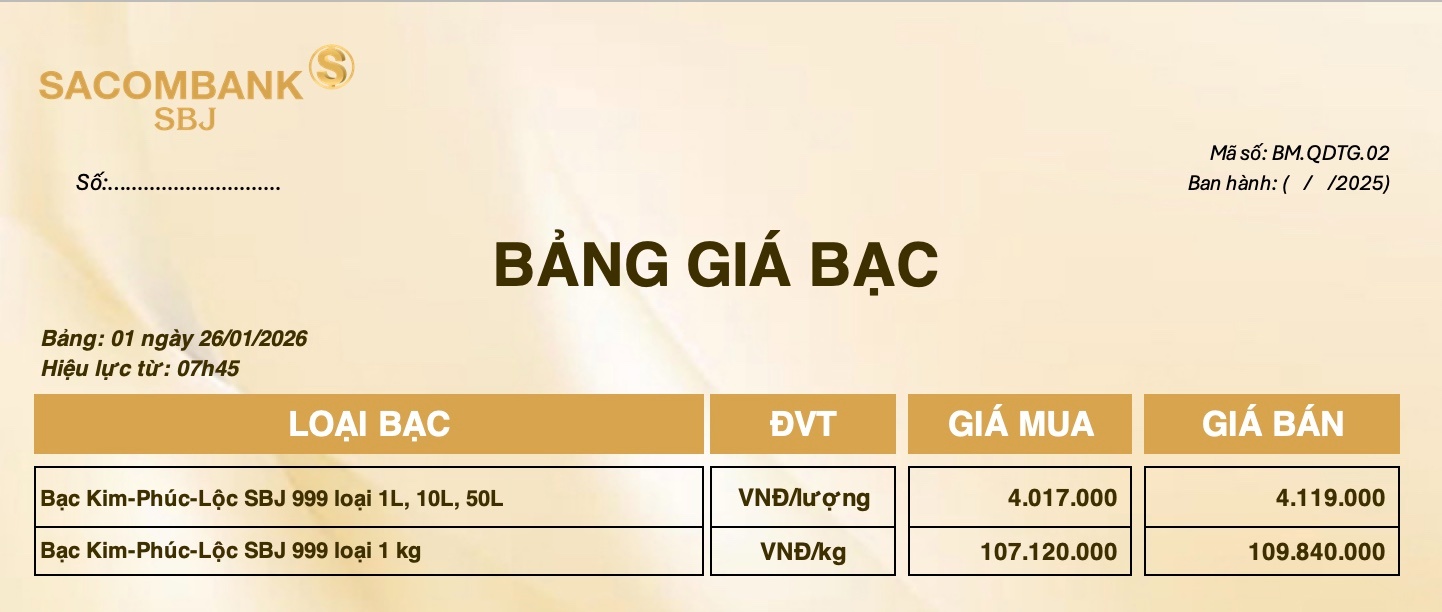 Bảng Tỷ Giá Bạc - Ngày 26/01/2026 - Bảng 2