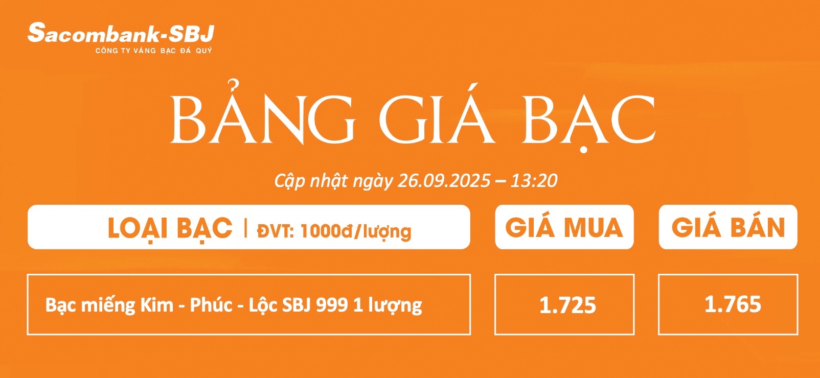 Bảng Tỷ Giá Bạc - Ngày 26/09/2025 - Bảng 4