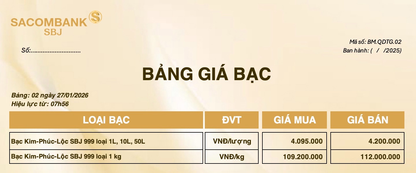 Bảng Tỷ Giá Bạc - Ngày 27/01/2026 - Bảng 2