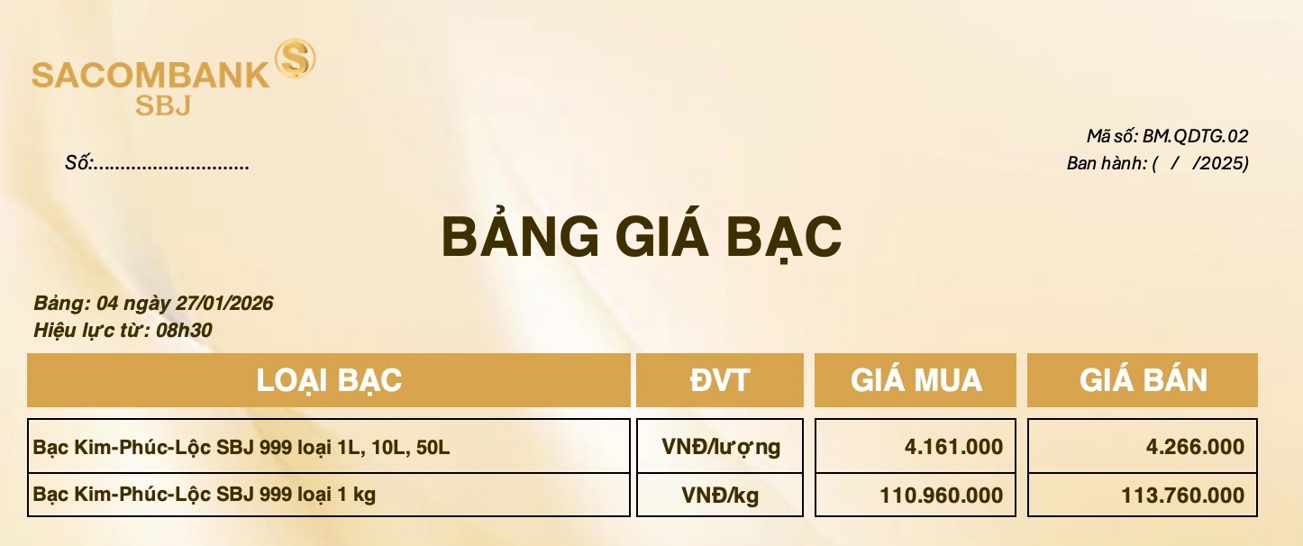 Bảng Tỷ Giá Bạc - Ngày 27/01/2026 - Bảng 4