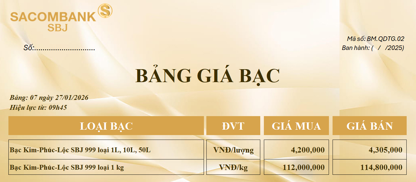 Bảng Tỷ Giá Bạc - Ngày 27/01/2026 - Bảng 7