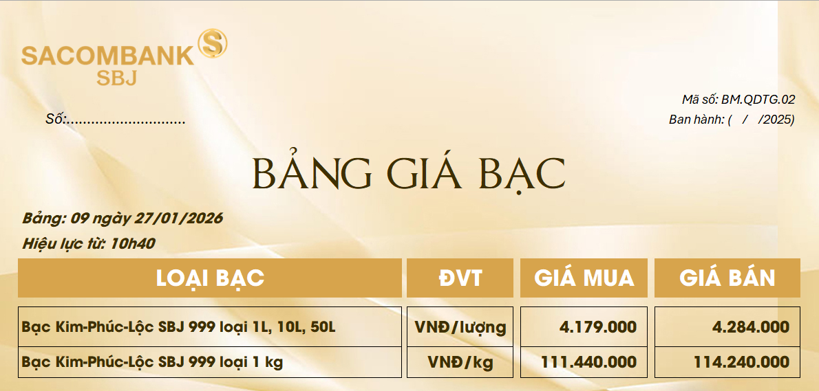 Bảng Tỷ Giá Bạc - Ngày 27/01/2026 - Bảng 9