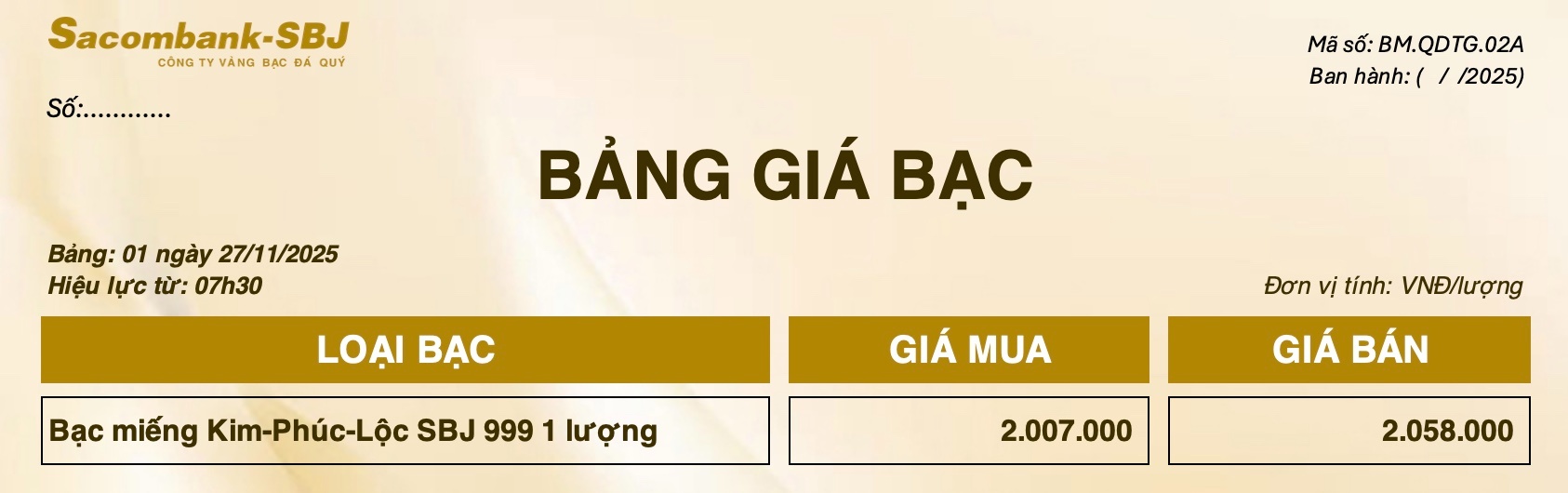Bảng Tỷ Giá Bạc - Ngày 27/11/2025 - Bảng 1