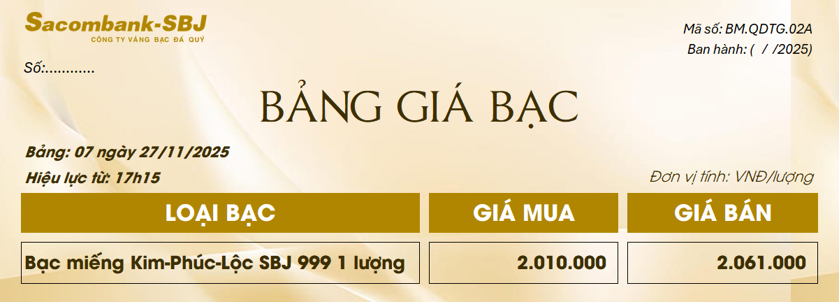 Bảng Tỷ Giá Bạc - Ngày 27/11/2025 - Bảng 7