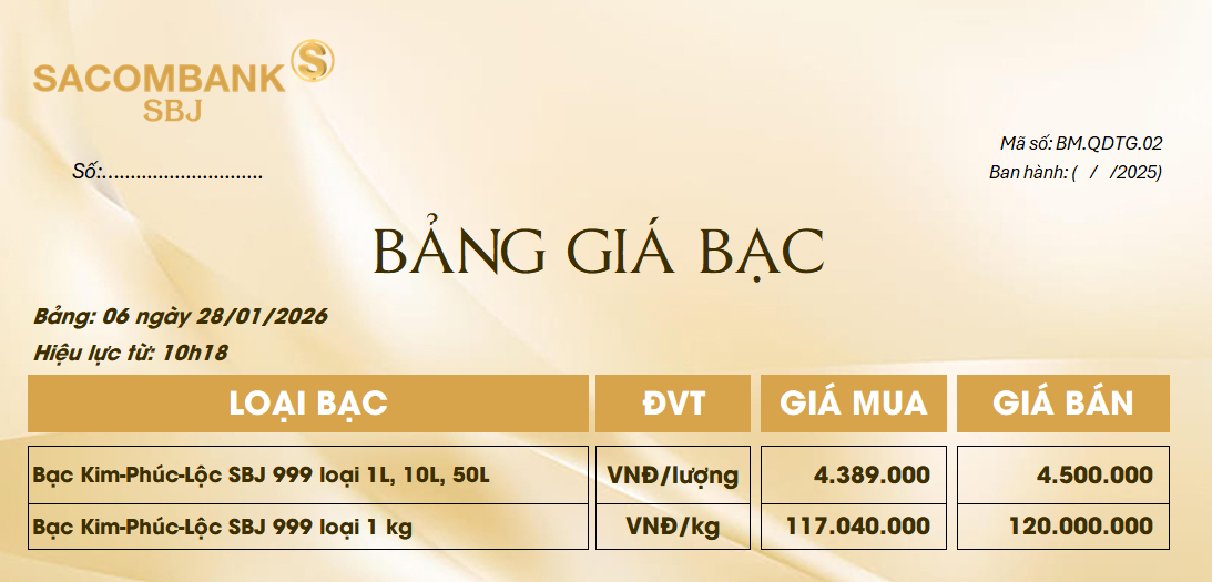 Bảng Tỷ Giá Bạc - Ngày 28/01/2026 - Bảng 6
