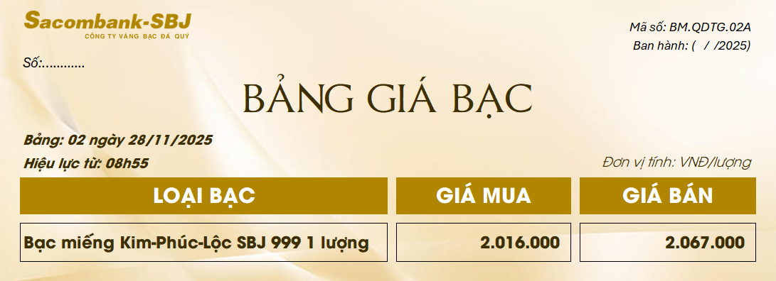 Bảng Tỷ Giá Bạc - Ngày 28/11/2025 - Bảng 2