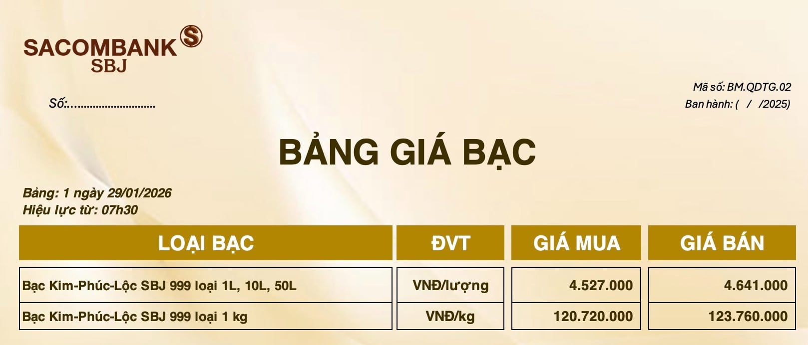 Bảng Tỷ Giá Bạc - Ngày 29/01/2026 - Bảng 1
