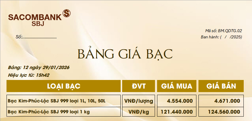 Bảng Tỷ Giá Bạc - Ngày 29/01/2026 - Bảng 12