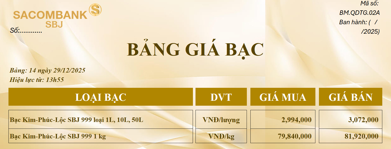 Bảng Tỷ Giá Bạc - Ngày 29/12/2025 - Bảng 14