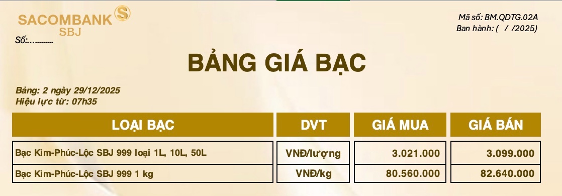 Bảng Tỷ Giá Bạc - Ngày 29/12/2025 - Bảng 2