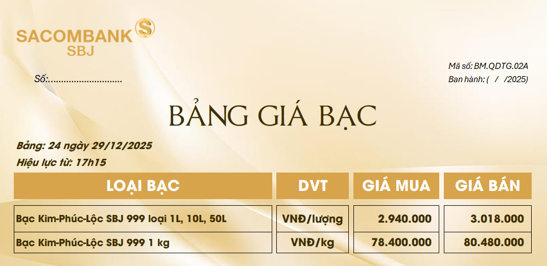 Bảng Tỷ Giá Bạc - Ngày 29/12/2025 - Bảng 24