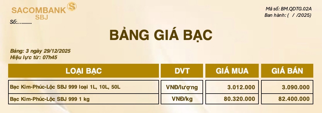 Bảng Tỷ Giá Bạc - Ngày 29/12/2025 - Bảng 3