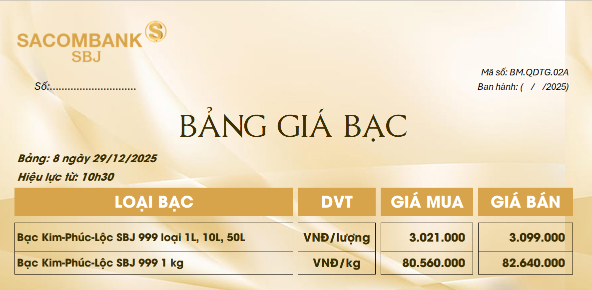 Bảng Tỷ Giá Bạc - Ngày 29/12/2025 - Bảng 8