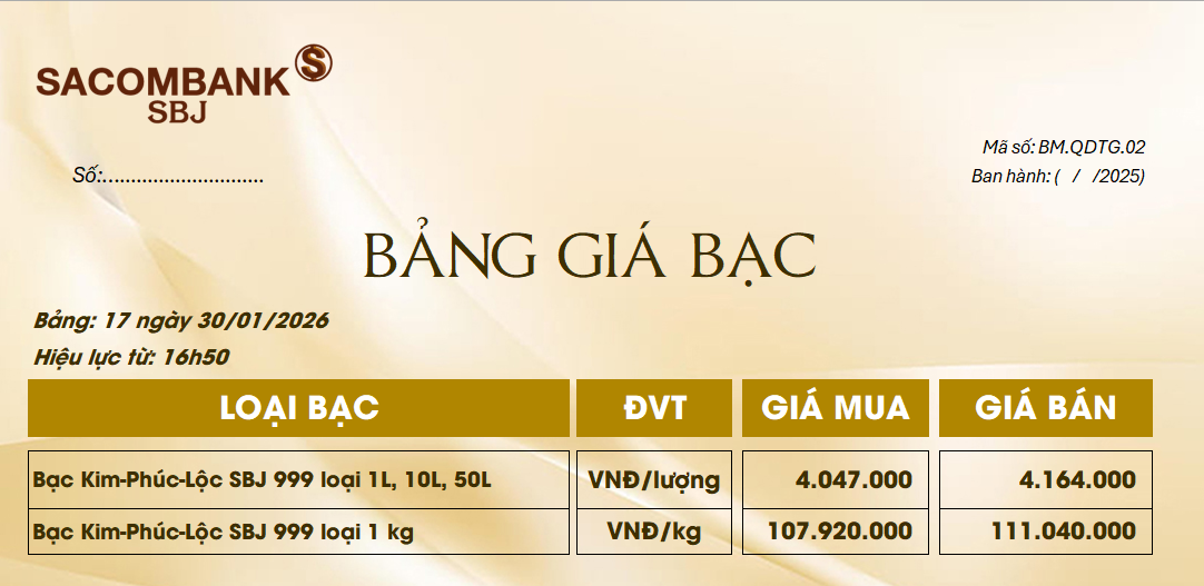 Bảng Tỷ Giá Bạc - Ngày 30/01/2026 - Bảng 17