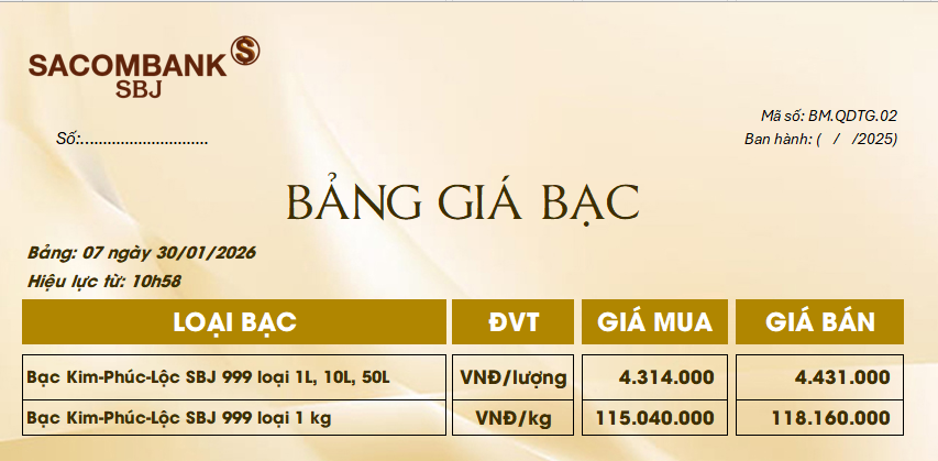 Bảng Tỷ Giá Bạc - Ngày 30/01/2026 - Bảng 7