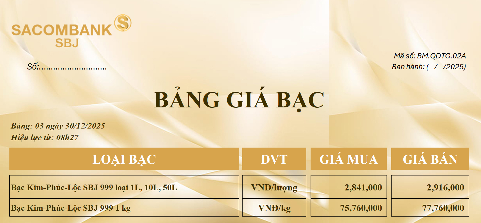 Bảng Tỷ Giá Bạc - Ngày 30/12/2025 - Bảng 3