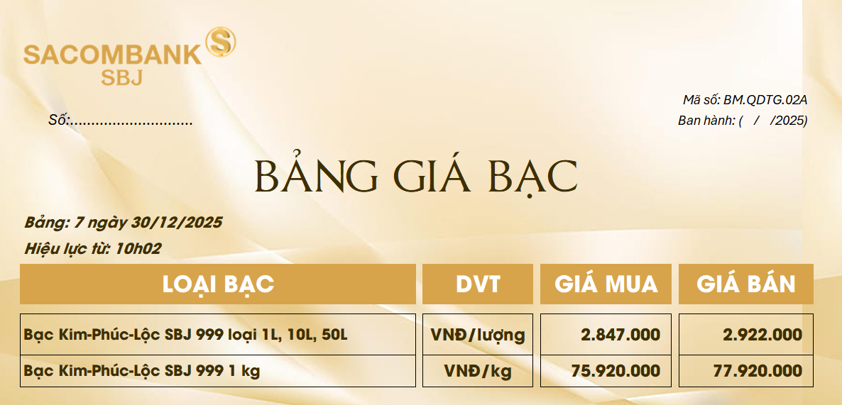 Bảng Tỷ Giá Bạc - Ngày 30/12/2025 - Bảng 7