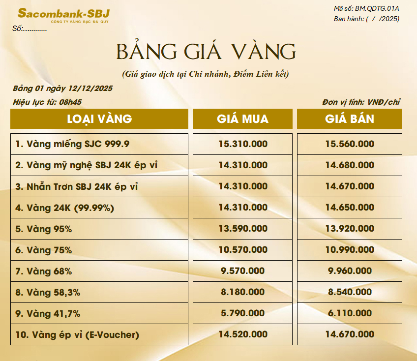 Bảng Tỷ Giá Vàng - Ngày 12/12/2025 - Bảng 1 - Tại Chi nhánh/Điểm liên kết