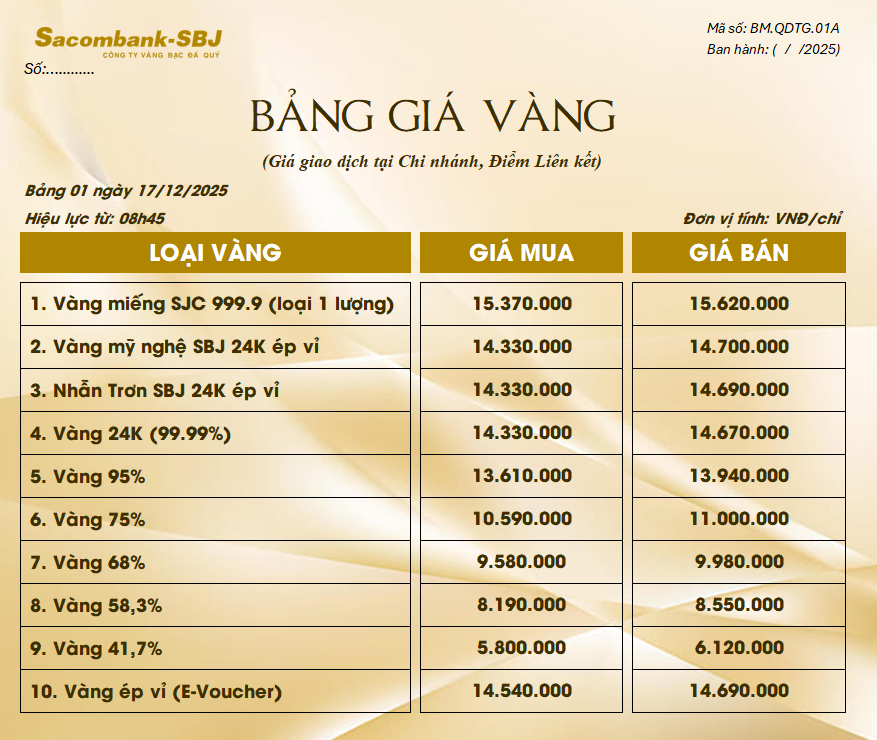 Bảng Tỷ Giá Vàng - Ngày 17/12/2025 - Bảng 1 - Tại Chi nhánh/Điểm liên kết