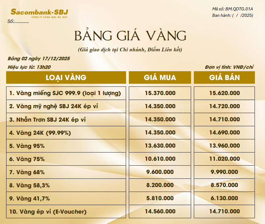 Bảng Tỷ Giá Vàng - Ngày 17/12/2025 - Bảng 2 - Tại Chi nhánh/Điểm liên kết